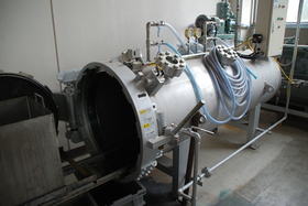 木材など、空隙を持つ材料の内部に薬液を注入する装置です。材料と薬液を入れた含浸槽を真空加圧タンク内に供給し、タンクの減圧により材料内の空気を除去した後、加圧により薬液を注入します。他の含浸処理法と比較して処理時間が短く、浸潤度の高い処理が期待できます。装置はエアー加圧、水溶性薬液の専用機です。難燃処理、防腐処理、樹脂処理、染色。設置機関